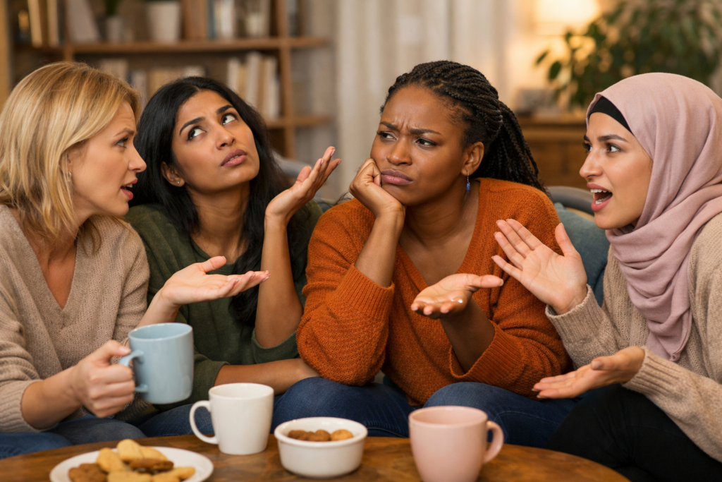 Women talking. Complaining. Venting. Laughing about things that are actually not that funny. He does not help. He does not listen. He is always tired. He does not understand. He thinks the kids are my responsibility. He thinks the house runs on magic.